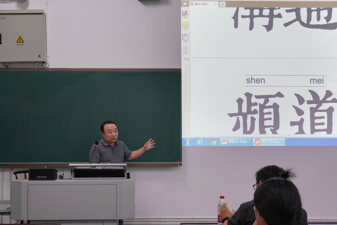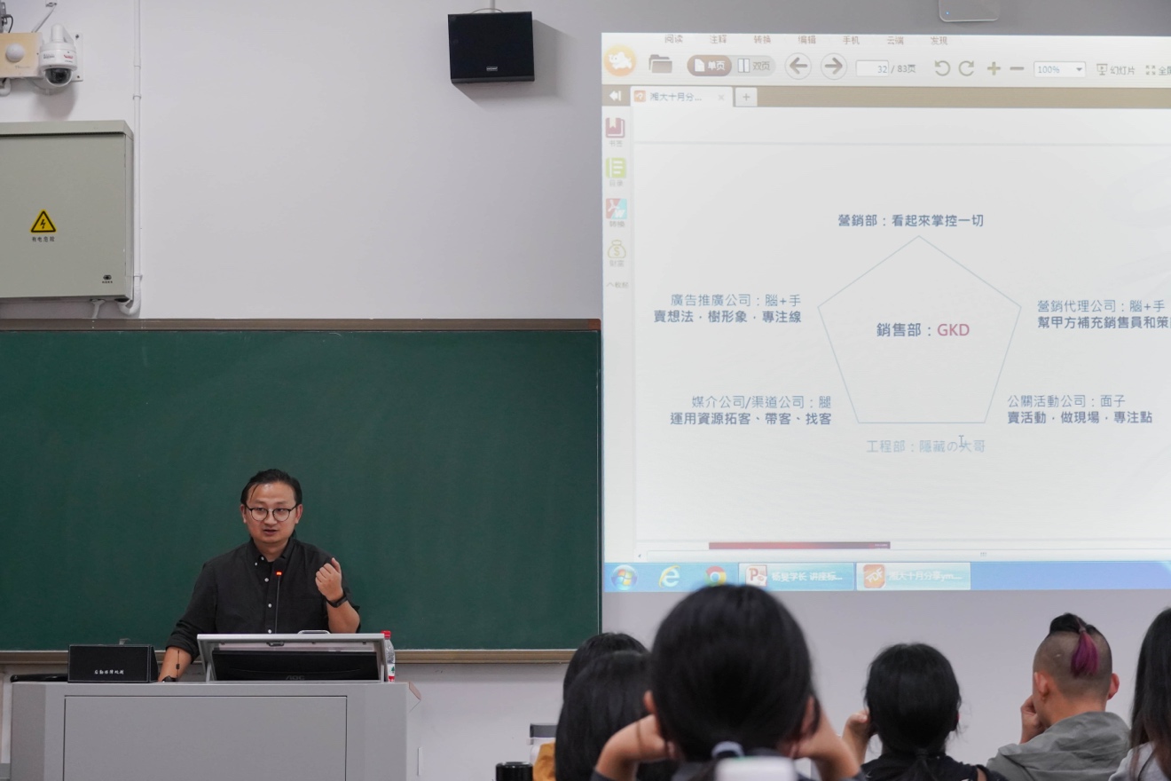 广告学专业2008届毕业生、湖南新意先声文化传媒有限公司联合创始人杨旻学长主讲,广告系主任孙丰国老师主持。