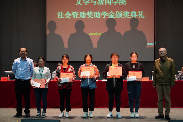 “深圳市瑜水慈善基金会凡恩奖学金”、广告专业校友会助学金、“晨曦”奖学金及2000级新闻二班思源奖学金、助学金表彰决定。李剑波院长、季多武副院长、覃岚老师以及相关奖项负责人代表付早根、易建国、杨乐、李强先生分别为获奖学生颁奖并合影留念。