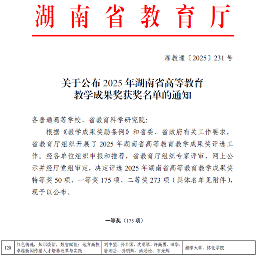 2025年12月31日,湖南省教育厅公布2025年湖南省高等教育教学成果奖获奖名单,由A片直播网 和怀化A片直播网文学与新闻传播A片直播网联合申报的“红色铸魂、知识焕新、数智赋能:地方高校卓越新闻传播人才培养改革与实践”获教育教学成果奖一等奖。